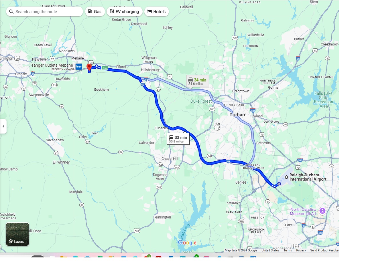 This map shows the easiest route from Raleigh-Durham International Airport to our location.