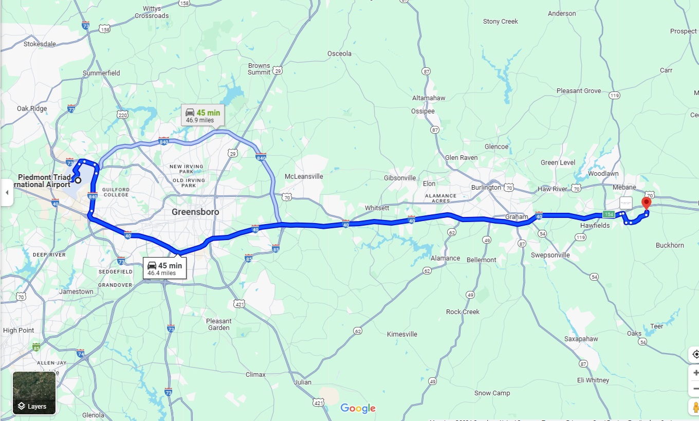 This map shows the easiest route from Piedmont Traid International Airport to our location.